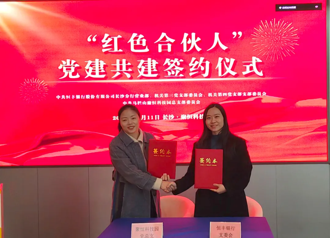 最后,在庄重热烈的氛围中,中共恒丰银行股份有限公司长沙分行营业部、机关第三党支部委员会、机关第四党支部支部委员会罗茜总与QM球盟会党总支支部书记盛丹共同签署了“党建共建协议书”,标志着双方正式建立了党建共建关系,开启了党建合作的新篇章。
