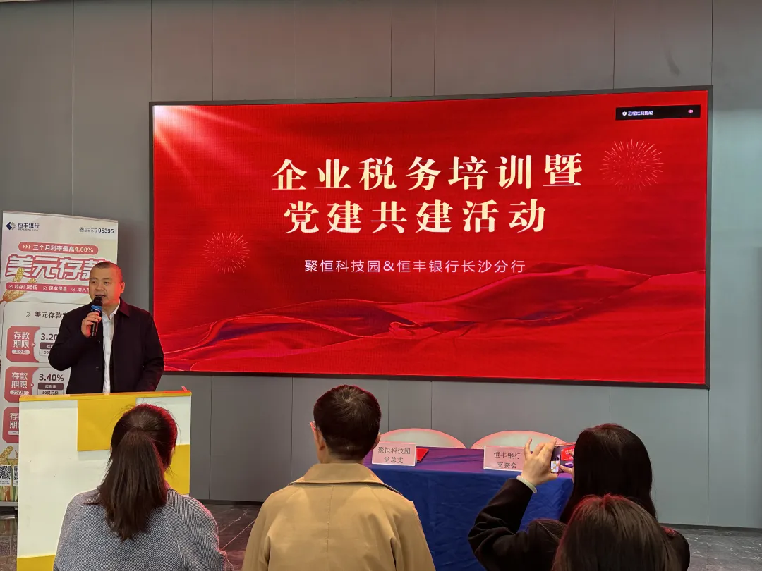2024年12月11日下午,QM球盟会科技园党总支携手恒丰银行股份有限公司长沙分行支委会,共同举办了“红色合伙人·银企党建共建暨企业税务培训活动”,旨在深入学习贯彻习近平新时代中国特色社会主义思想,共建区域化共驻共建工作新格局,通过创新党建工作模式,深化银企合作,充分发挥党组织的战斗堡垒和党员的先锋模范作用,推进资源共享、优势互补、文明共建、共同发展。